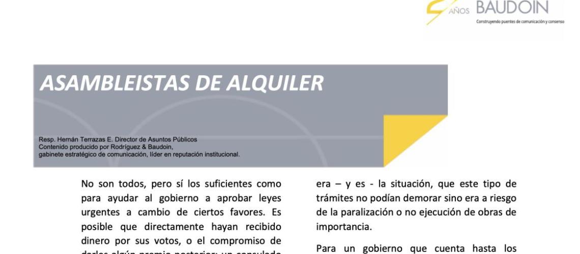 No son todos, pero sí los suficientes como para ayudar al gobierno a aprobar leyes urgentes a cambio de ciertos favores. Es posible que directamente hayan recibido dinero por sus votos, o el compromiso de darles algún premio posterior: un consulado para un pariente, viajes internacionales en comisión, sin nada que hacer y todo pagado, unos cuantos vales más para alimentación y algún otro regalito de ocasión.